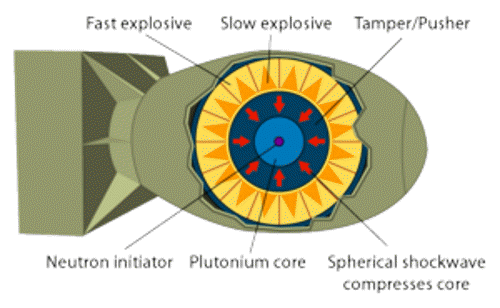 Inside Fat Man Implosion_Nuclear_weapon.gif At the center of Fat Man was a neutron initiator, surrounded by a semi-critical sphere of plutonium. This was placed in the center of a hollow sphere of specially placed fast and slow high explosives. Numerous detonators located on the surface of the high explosive were fired simultaneously to produce a powerful inward pressure on the core, squeezing it and increasing its density, resulting in a supercritical condition and a nuclear explosion.