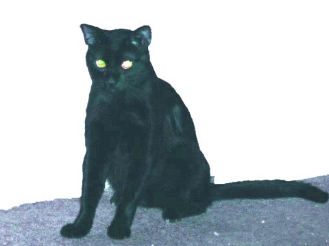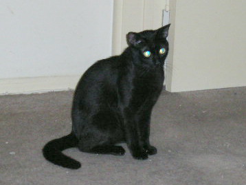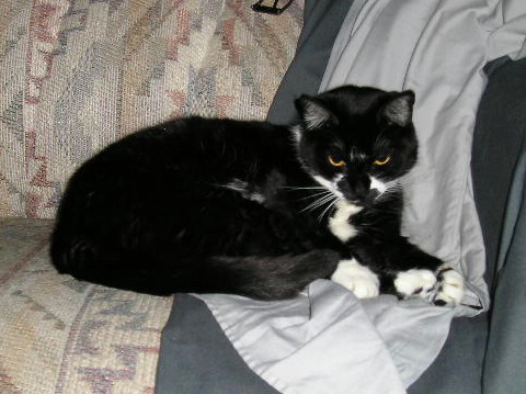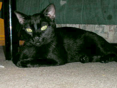 UPDATE 07-03-2005: The decision was made that Grumby would stay. For the first week, he spent most of his time hiding under the bed to avoid conflicts with Penny and Cuddles. By the end of the first week I decided that no progress would be made with them unless they were forced to interact with each other. Grumby would have to be kept out of the bedroom, at least while I'm home and can watch them. I decided it was time to vacuum the bedroom and that was all it took for him to be out the door like a streak of lightning. In the following days I found the easiest way to get Grumby out from under the bed and out of the bedroom is with the use of a blow hair dryer set for air only. Just one or two seconds aimed under the head of the bed and he goes shooting out the bedroom doorway. Then I just shut the door for the rest of the day forcing him to share space with Penny and Cuddles. At first, he would tend to stay in a corner under an end table but with each passing day, he would come out into the room more and more and interact with the other cats very cautiously.